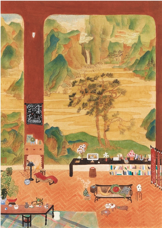 作品描述:家,是生命中不可或缺的情感容器与多巴胺能量场域。她不仅承载着日常的休憩与释放,更是创造快乐、滋养心灵的宁静港湾。如何在传统中国山水画的气韵中,巧妙融入现代生活的物象与精神,这无疑是当代画家需要深入思考的命题。为此,我一直在尝试探索中国山水画在当代语境下的多样可能——不仅传递其独特的视觉韵律,寻求心灵的慰藉与寄托;更致力于将那份悠远的“可游、可居”之境,转化为构建现代人理想栖居空间的美学基石。