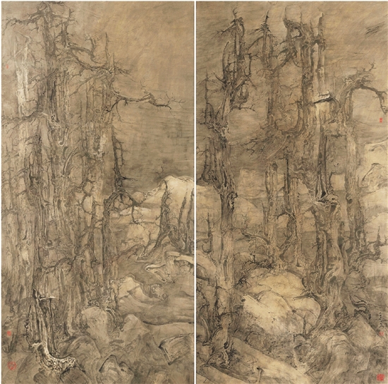 曾海波 古木寒林 124×248cm×2 纸本水墨 2025年